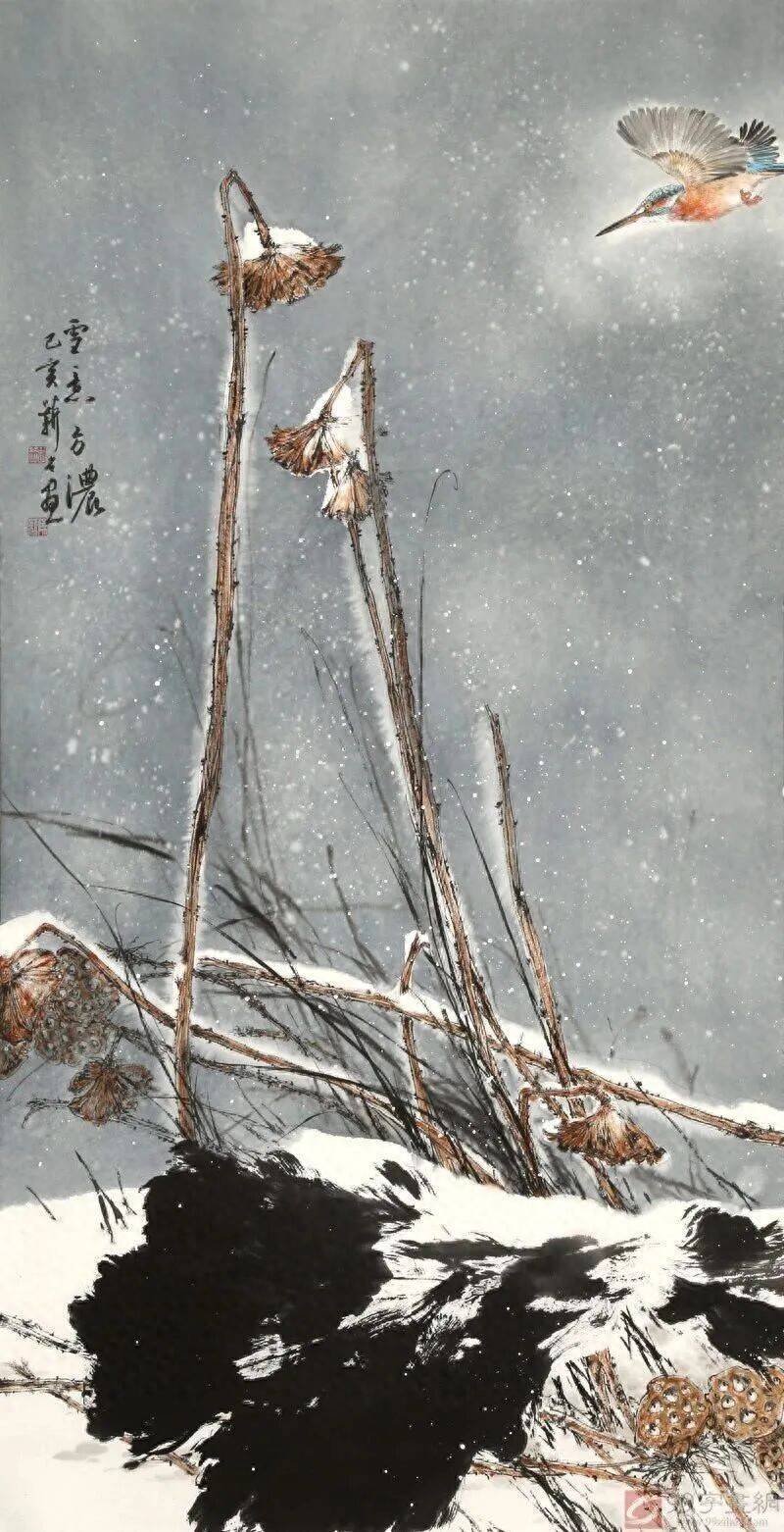 陈薪名的水墨,表面冷得能结冰,骨子里却热乎得冒烟。他画雪景花鸟,不是为了表现“高冷”,而是想告诉观者:再冷的天,也有生命在蹦跶;再单调的世界,也能被画出花来。看他的画,就像冬天里啃了口冰糖葫芦——外头冰得直哆嗦,里头甜得直咧嘴。