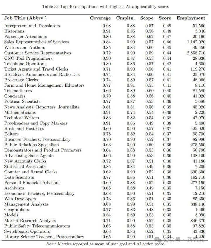 论文中,微软分析出了以下最容易被替代的40个岗位: