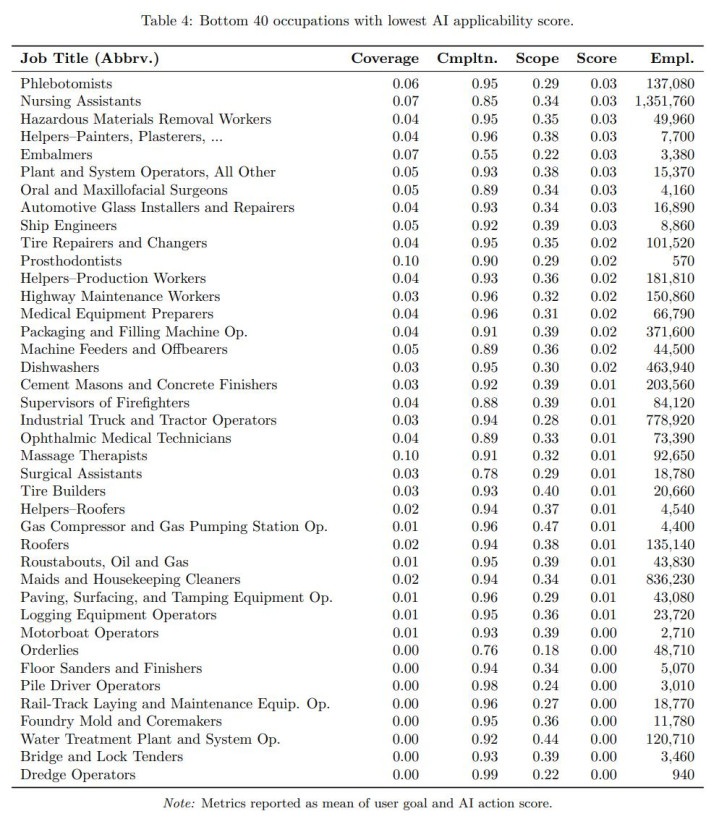 微软也同时在论文中帮我们分析出了最不容易被AI替代的40个岗位: